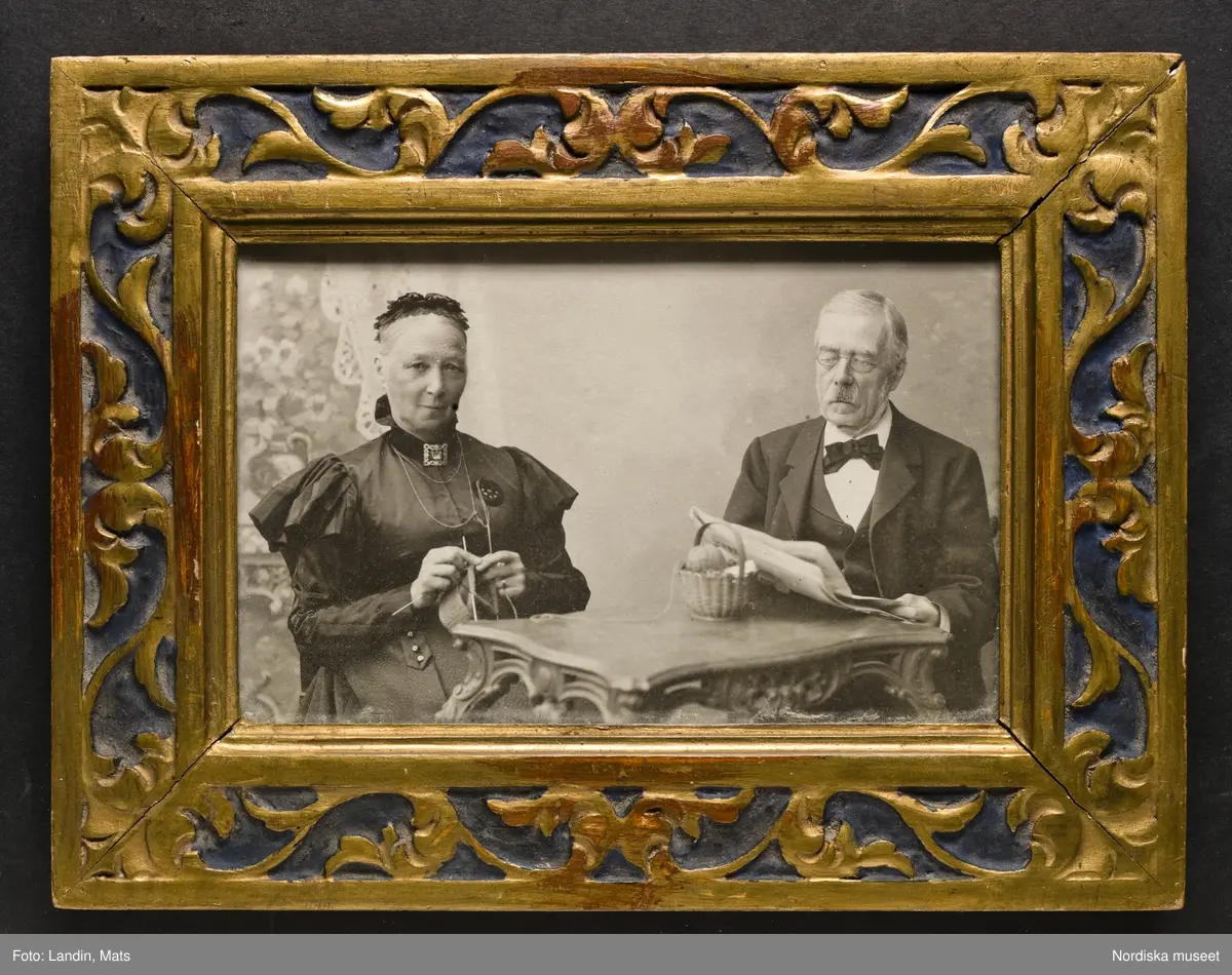 Porträtt av äldre man och kvinna sittande vid bord. Kvinnan klädd i mörk klänning och liten hätta på huvudet. Stickar. Mannen med glasögon, vit skjorta, väst och kavaj. Läser tidningen. På bordet liten korg med garnnystan. Fotografi i ram av trä med snidat, dekorativt mönster. Målad i blått och guld.