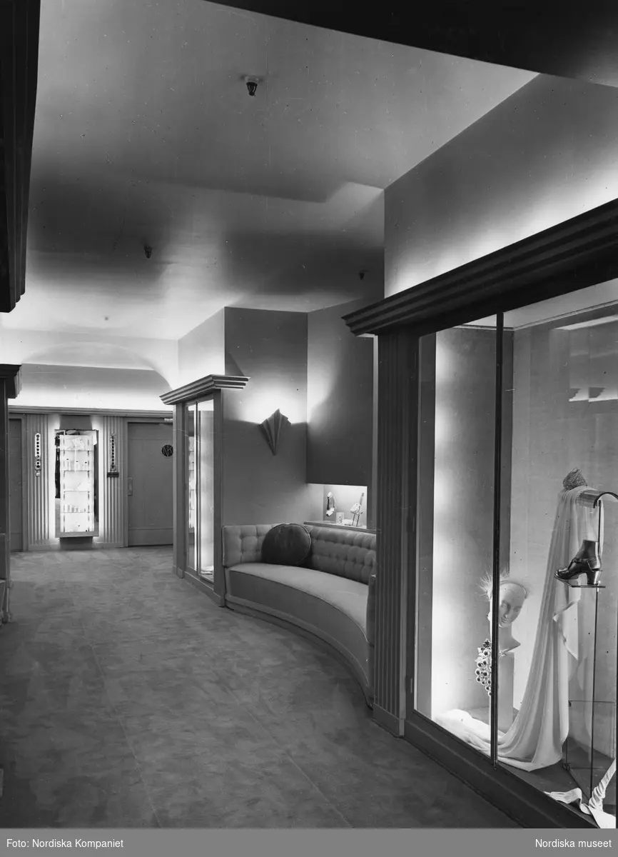Interiör från NK, Nordiska Kompaniet, Franska avdelningen. Inredning i nyklassicistiskt inspirerad stil med ljusa färger, soffa, heltäckningsmatta och stora skåp med glasdörrar där kläder och accessoarer skyltas. 1 september 1939. Salongen på plan fem uppdaterades 1939 i luxuös stil med klassicistiska inslag signerad NK:s stilbildande inredningsarkitekt Svend A Thoresen. Den pärlgrå signaturkulören som introducerades 1926 omsluter nu hela rummet.