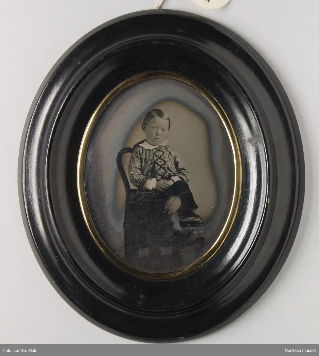 Porträtt av pojke i helfigur, sittande med benen i kors på stol, utrustad med en extradyna. Iklädd rutig skjorta med vit krage, svarta vadlånga byxor, randiga strumpor och svarta kängor. Ambrotyp i ram. På baksidan etikett: "B J LUNDBERGH/Photograf/i/STOCKHOLM/Hörnet af Göthgatsbacken och Urvädersgränd No 2, 1/2 tr. upp". Med bläck: "Erik Kock".