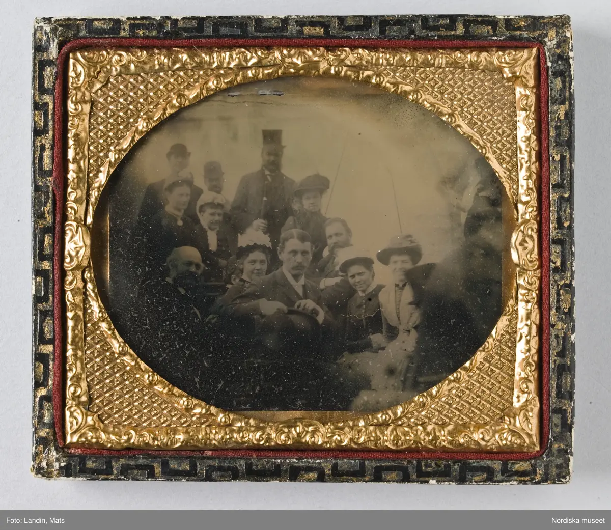 Gruppbild av män och kvinnor utomhus, stående och sittande. Ambrotyp i ram.