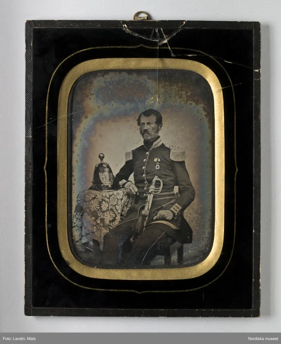 Porträtt av okänd militär, knästycke. Snedbena, polisonger och mustascher. Iklädd uniform med långrock, guldgaloner kring krage och muddar samt epåletter. Handkolorerad medalj på uniformsbröstet. Sabel. Pickelhuva på litet bord.