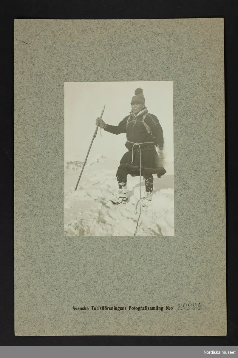 Porträtt av samisk man stående i snö med stav i handen. Påskrift "Kebnekajse Nia på toppen 29 juli 1906".