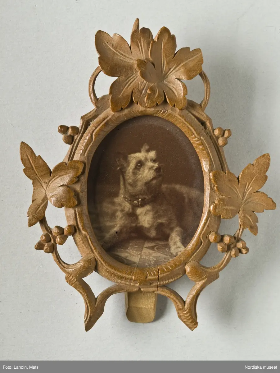 Hundporträtt. Fotografi i snidad träram med genombruten vinlövsornamentik.