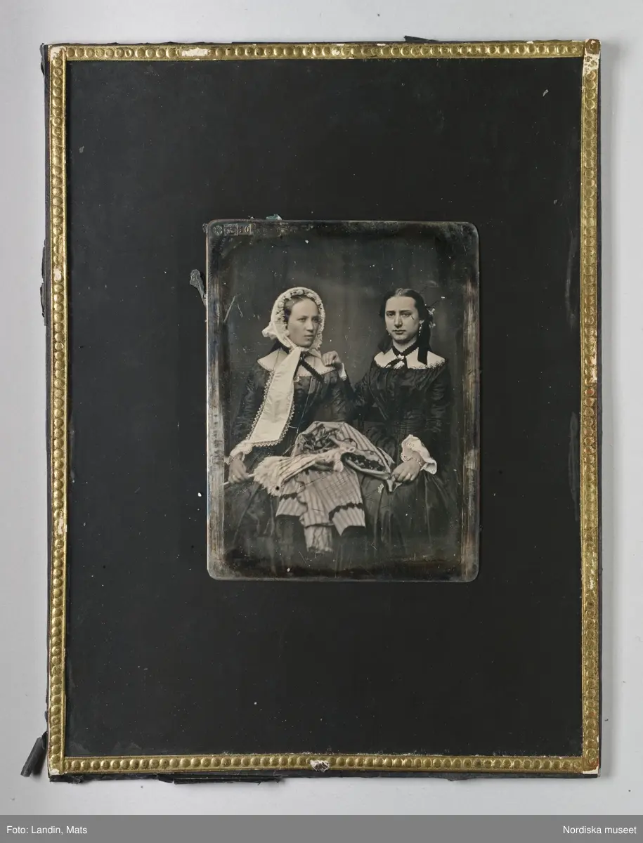 Porträtt av två unga kvinnor. Daguerrotyp i ram av senare datum. Nordiska museet inv.nr 205464