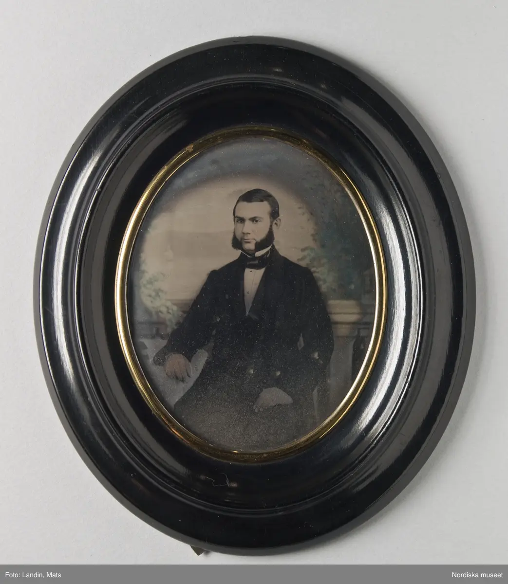 Porträtt av grosshandlare August Möller. Ambrotypi i svart ram med glas och förgylld inre kant. Text på baksidan: "W. A. Eurenius P. L. Quists Fotografiska atelier/ i/Stockholm, Regeringsgatan No 14".