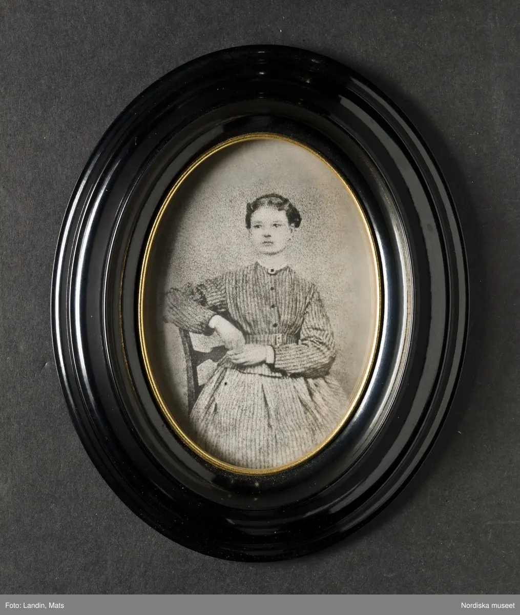 Porträtt av kvinna, Ingrid Stina Pettersdotter år 1872, då hon var 16 år. Påskrift på ramens bakstycke: "Mamma/1872/Ingrid Stina/Pettersdotter/född 29/11 1856". Sittande på trästol, iklädd randig klänning. Fotografi i ram, troligen inte originalfoto.