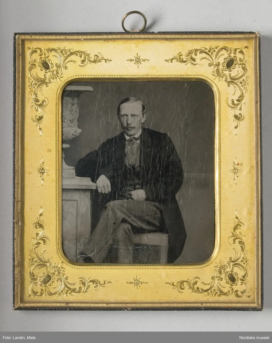 Porträtt, knäbild av sittande man. Klädd i svart bonjour, grå byxor, vit skjorta och mönstrad halsduk. Panotyp i ram.