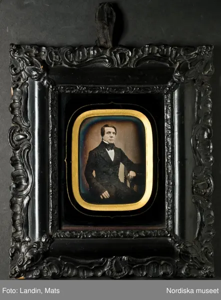Mansporträtt, sittande knästycke, trekvartsprofil. Okänd medlem av släkten Bergström. Lätt skadad ram av trä och gips, ornament i nyrokoko, svartlackerad; upphängningsögla av svart ripsband; ramen lätt skadad. 1850-tal. Nordiska museet inv.nr. 27057a.