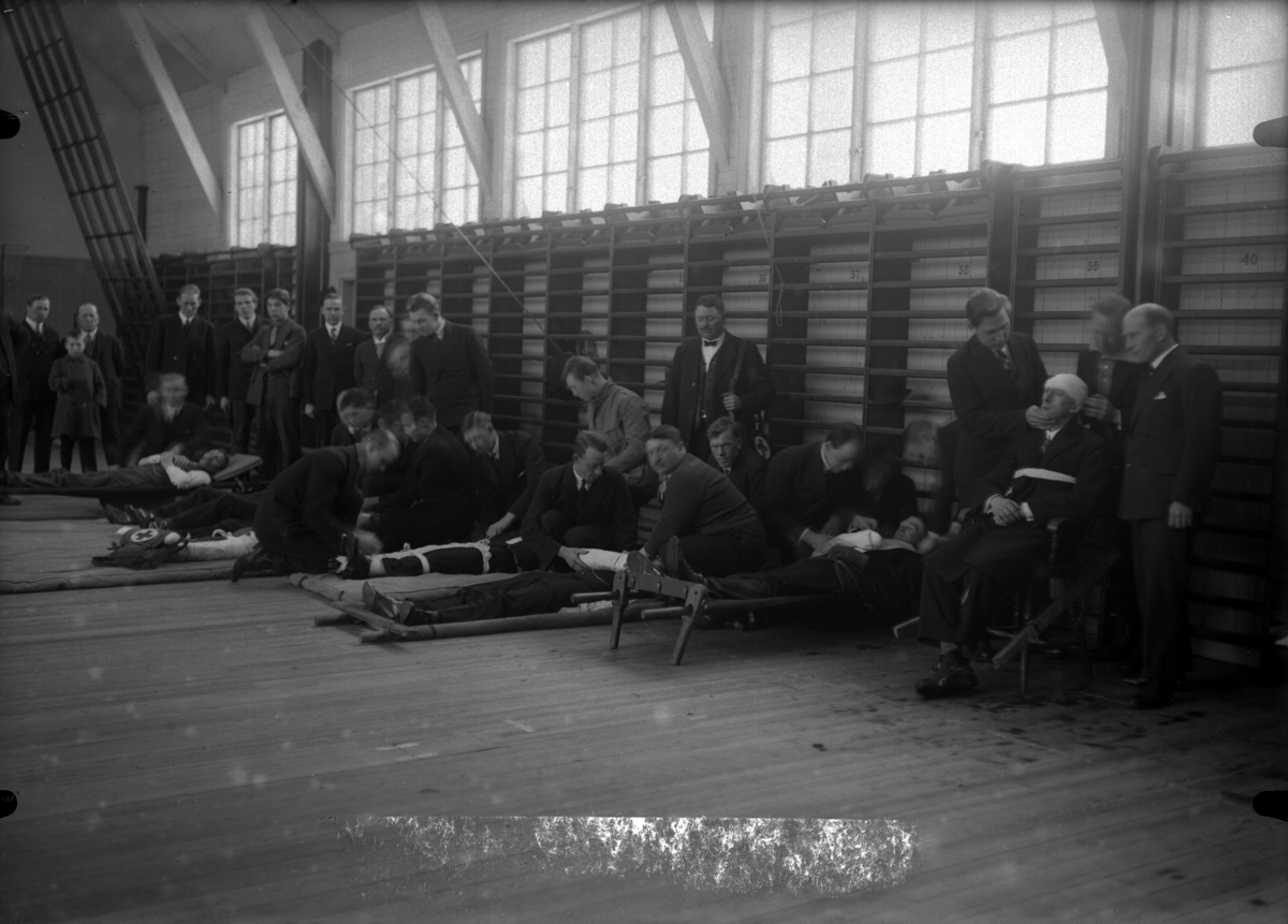 Röda Korsets Kalmarkrets genomför sjukvårdsutbildning i en gymnastiksal.