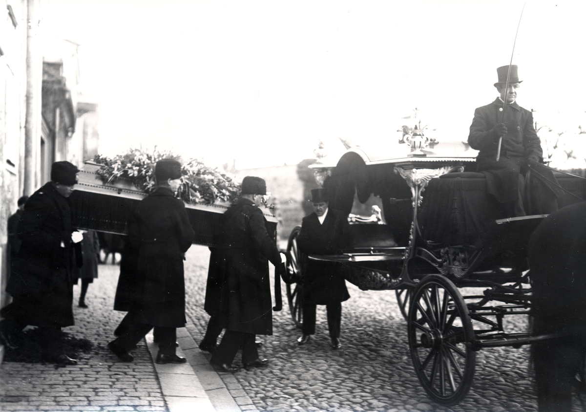 Begravning: Före avfärden från Lilla Torget. Vid likvagnen, i hög hatt, direktör Hilding Berg Kalmar Begravningsbyrå.