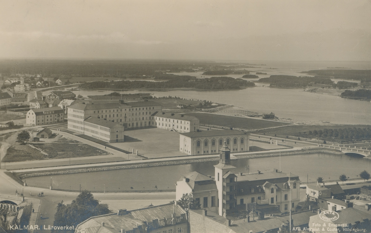 Vykort över Kalmar högre allmänna läroverk, nuvarande Stagneliusskolan. Bakom Fredriksskans, ute i Malmfjärden, syns ett av Kalmars fyra klapphus. Det revs senast 1940.
