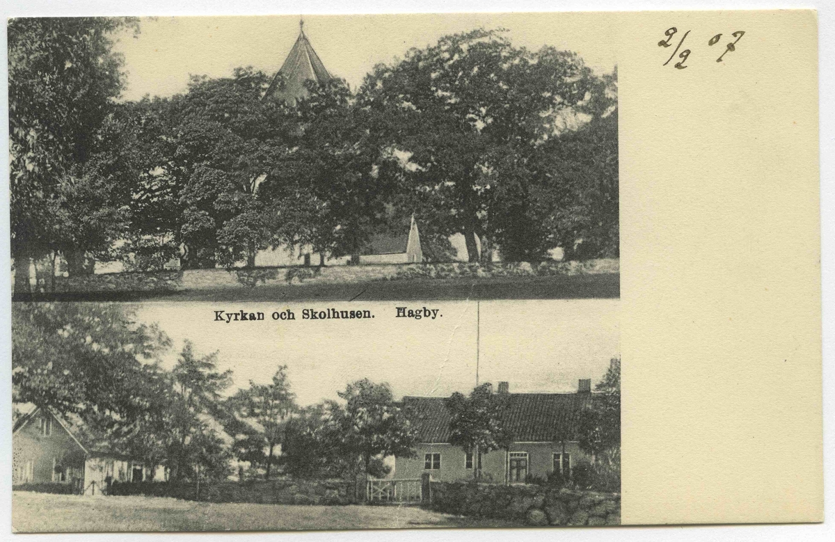 Vykort med motiv av Hagby kyrka och skolhusen.