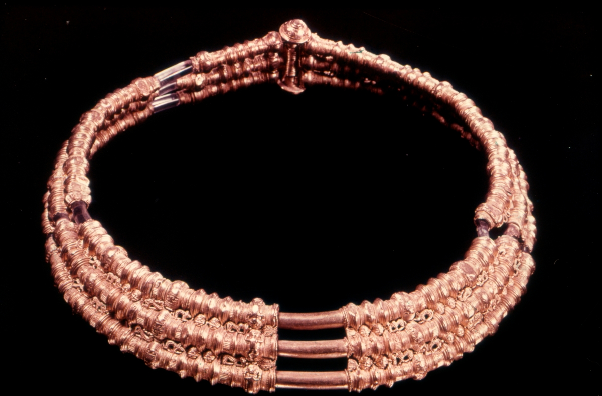 Halssmycke av guld,bestående av fem rör, ornerade med drakfigurer med flera sirater inlagda mellan rören, försedd med gångled för att kunna öppnas.