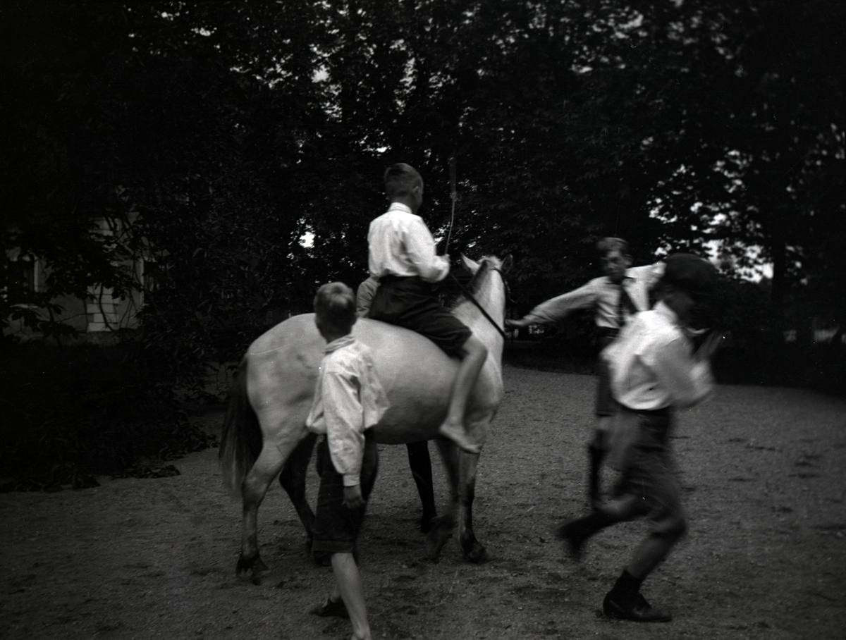 Från vänster: Tore, Sven på hästen Stumpan, Hans och Lars.