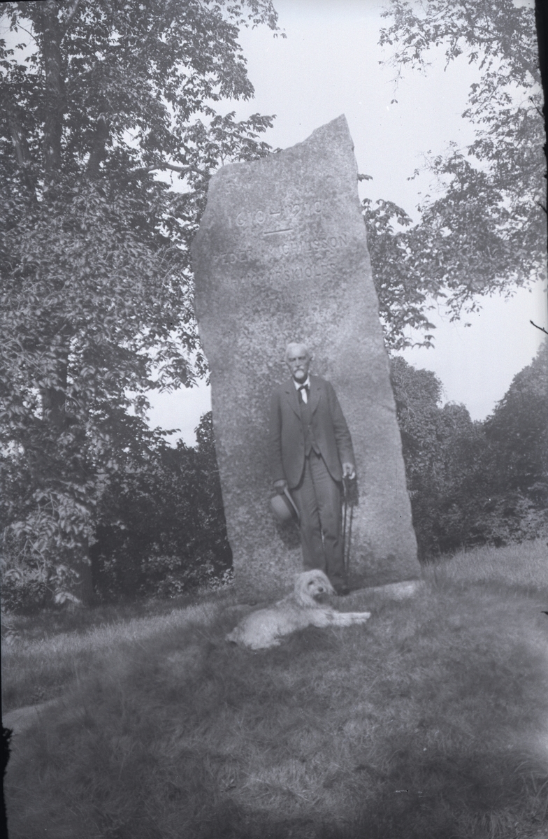 En man och en hund framför en minnessten. Stenen är ett minne över att det var 300 år sedan Peder Mikaelsson, den första Hammarskjöldaren, blev adlad.