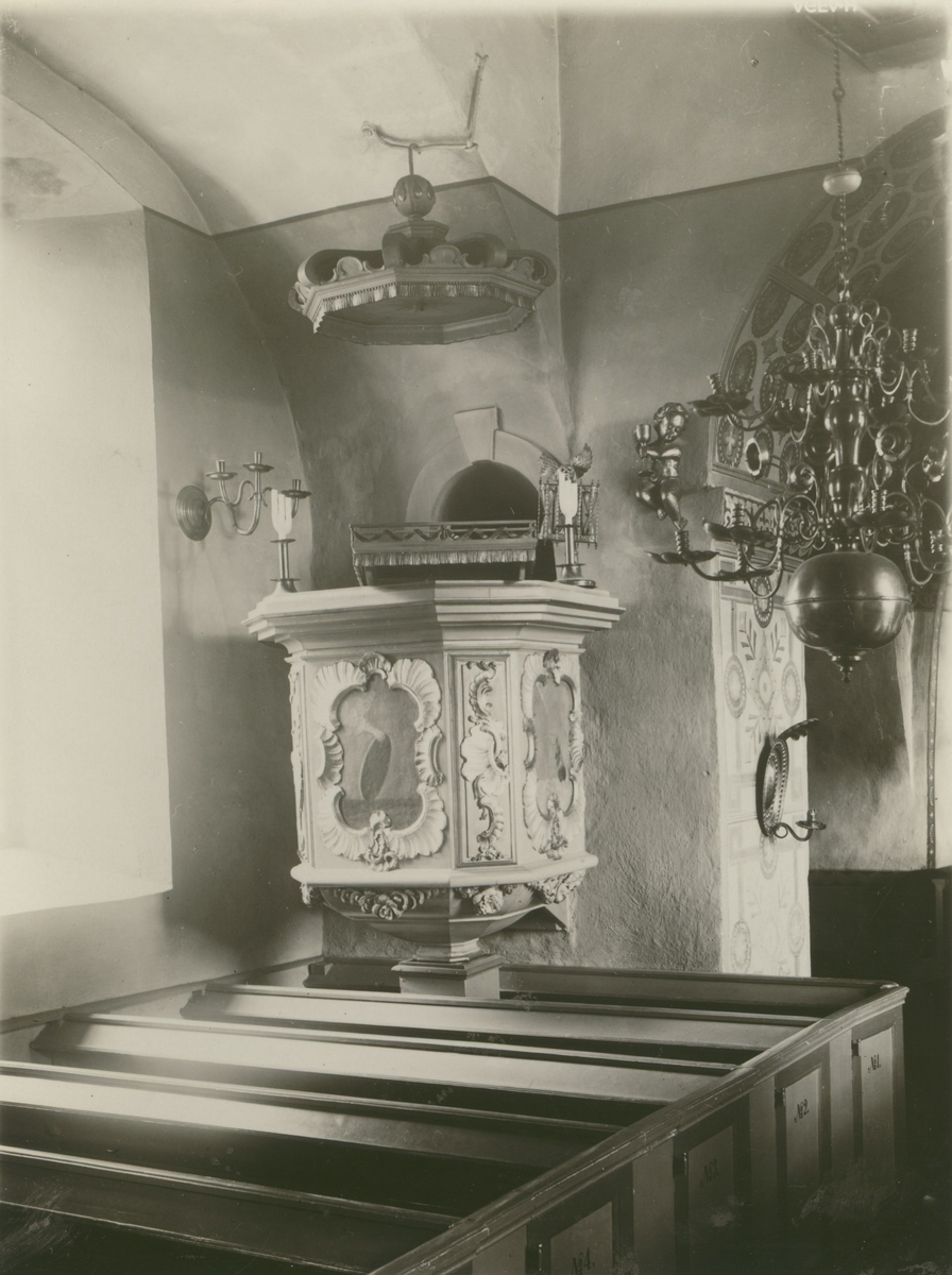 Predikstolen i Hossmo kyrka, utförd 1768 av bildhugaren Jonas Berggren.