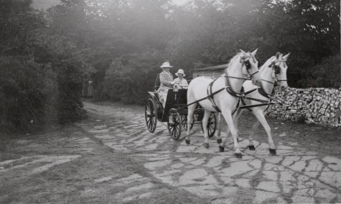 Två damer i vagn, förspänd med två vita hästar. Bild från Skälby gård 1924.
