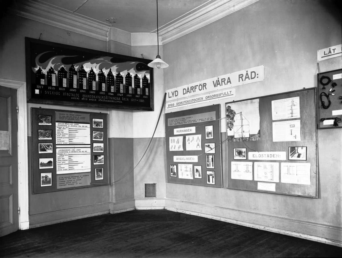Informationstavlor om brandskydd vid en utställning av Svenska brandskyddsföreningen.