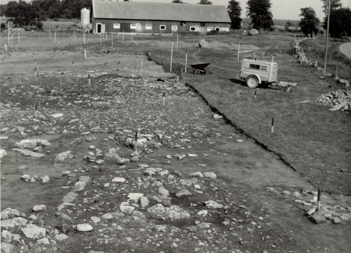 A2. Rektangulär skadad i östra delen. I centrum syns en liggande kalkstensflisa. I bakgrunden, delvis framrensad den stora stensättningen.