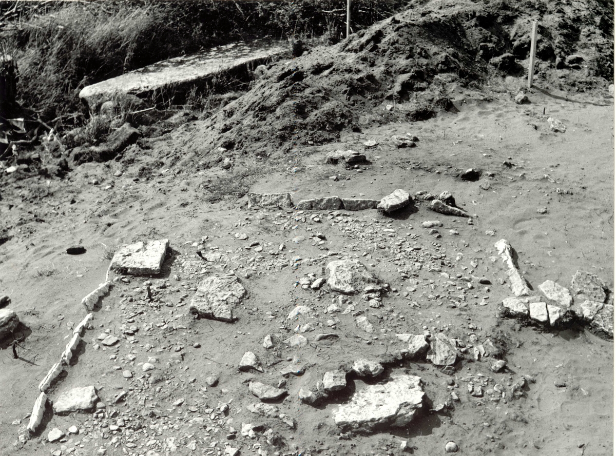 Kvadratisk flissättning framrensad. Norra delen av anläggningen svårt skadad. Foto från nord-nordost.