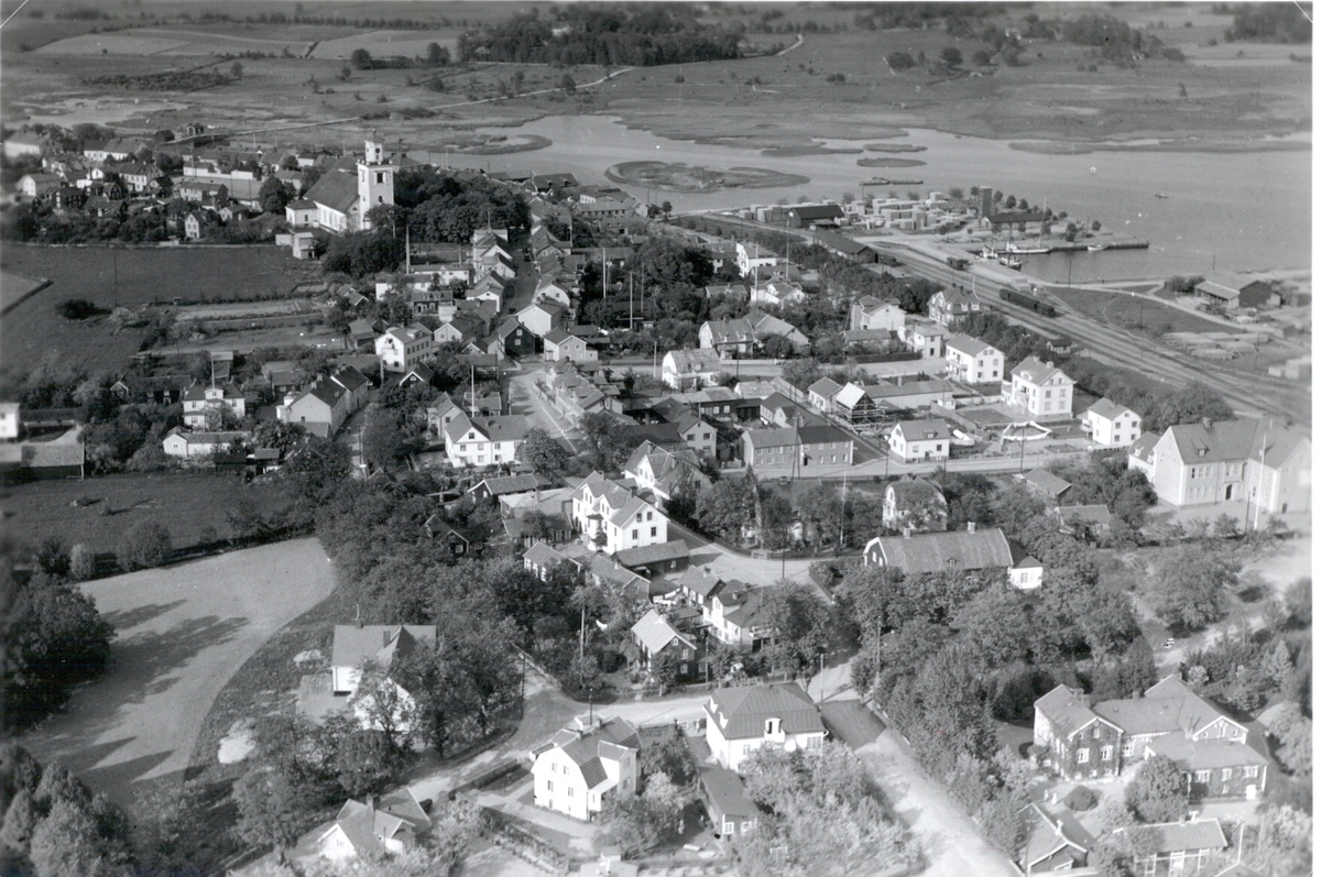 Flygbild över Mönsterås från söder med kyrkan i fonden. Till höger i bild syns det inre av Mönsteråsviken och något av köpingens hamnanläggningar. Järnvägsstationen med därtill hörande spårområde finns i bildens högra del.