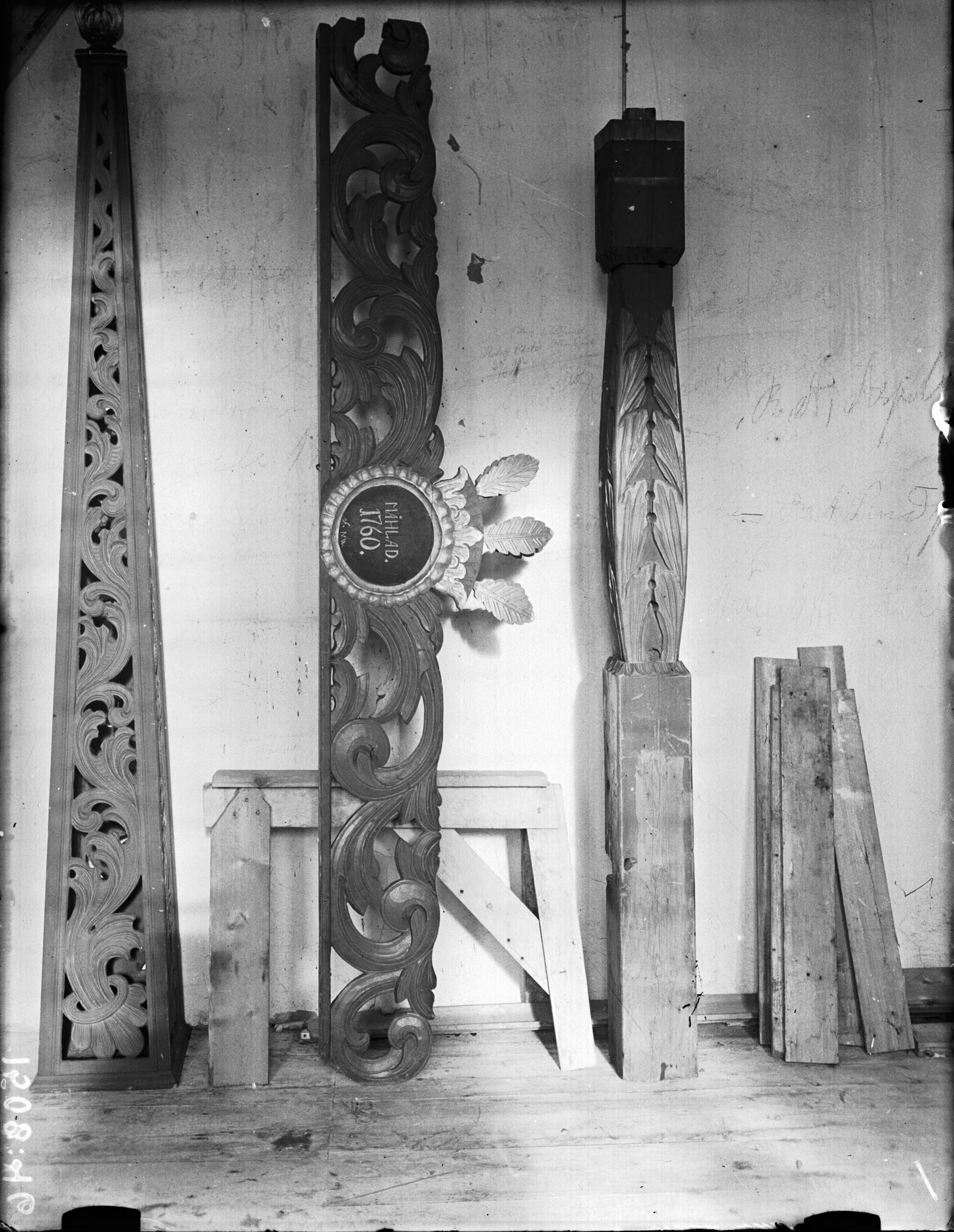 Pyramider till korskrank i furu med rankverk och överstycken av utskuret och målat trä samt pelare av detsamma. Snabbinv.