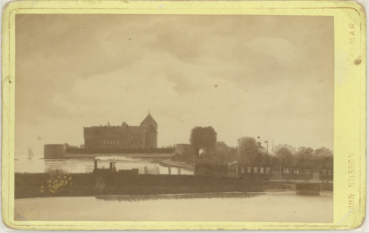 Kalmar slott 1874-1885. Järnvägen (1874) finns men Helgo Zetterwall (1831-1907) har ännu inte påbörjat de renoveringar av slottet som han ledde 1885-1991. Det var under dessa renoveringar som tornen på slottet fick sitt nuvarande utseende.