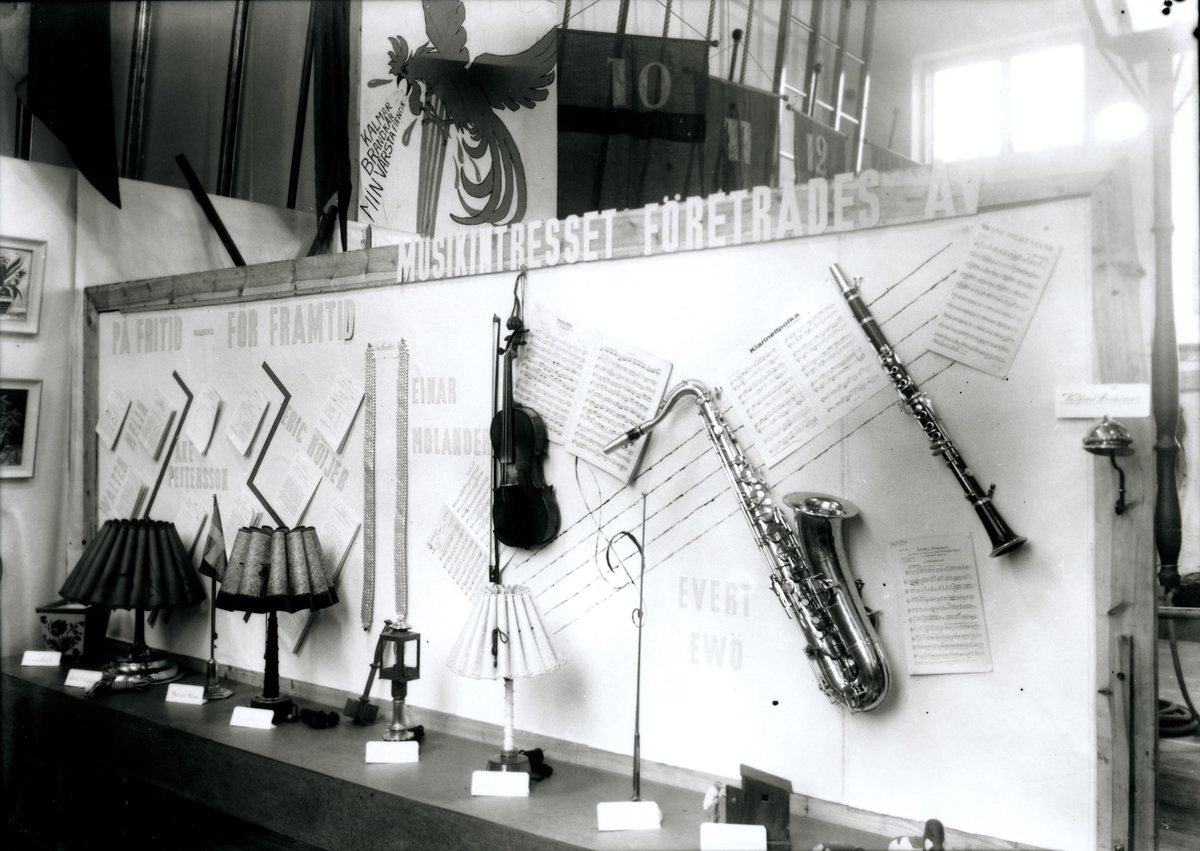 Brandkåren, utställning på brandstationen med olika musikinstrument och lampor.
