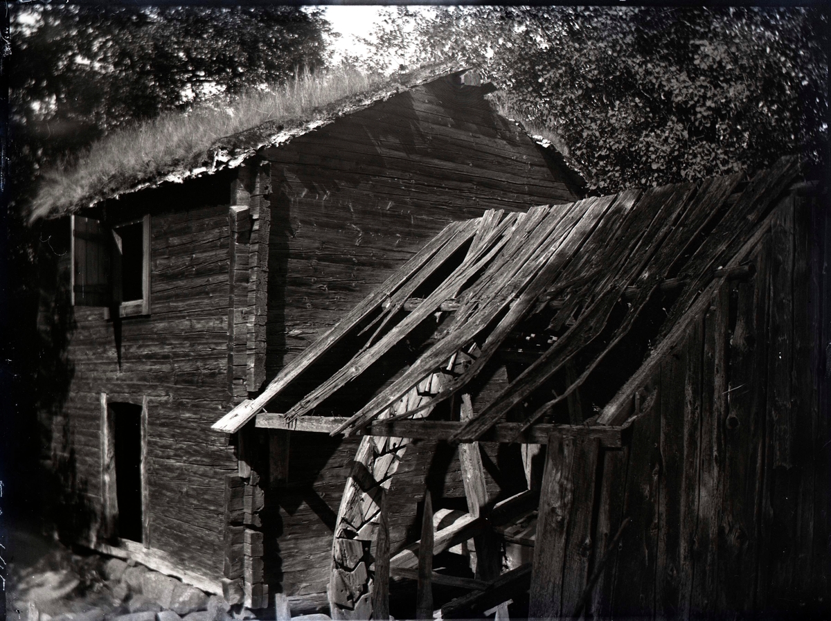 Kvilla vattenkvarn, förfallen sedan 25 år före fotografiet var taget. På innerväggen står målat : 1858 JSS = Jonas S. Svensson. Foto från 17/7 1928.