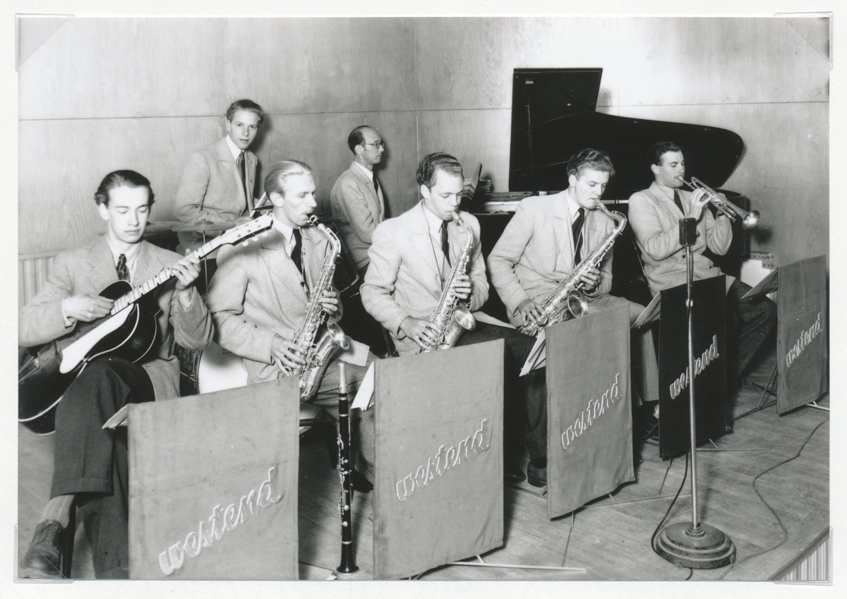 Westend dansorkester, från vänster: Gunnar Axelsson - gitarr, Lennart Gustafsson - trummor, Gösta Hamnede - Altsax, Sten "Bom" Hasselström - piano, Thor-Ebbe Karlsson - Altsax, Arne Delborn - tenorsax, Arne Gårdinger - trumpet.