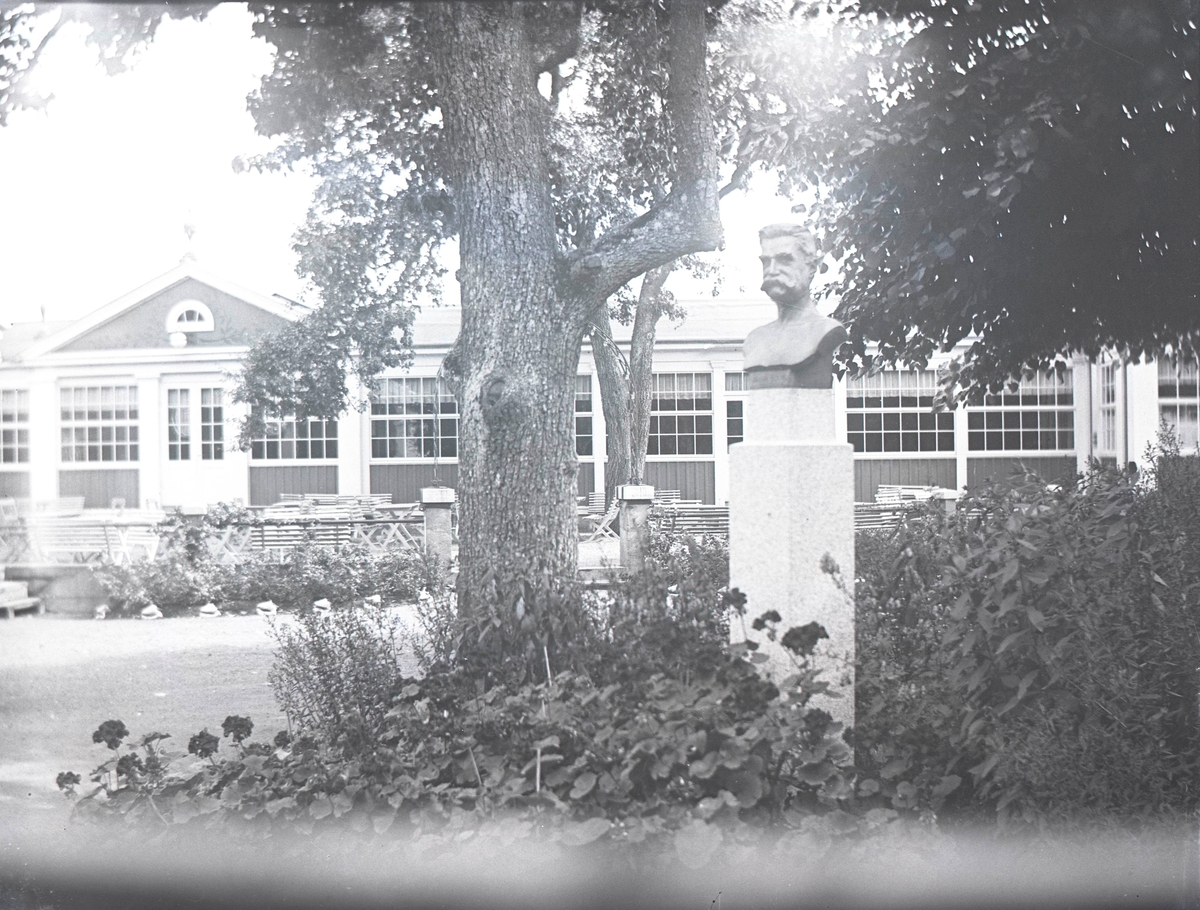 En byst av Hjalmar Branting med Folkets parks paviljong i bakgrunden i Kalmar.