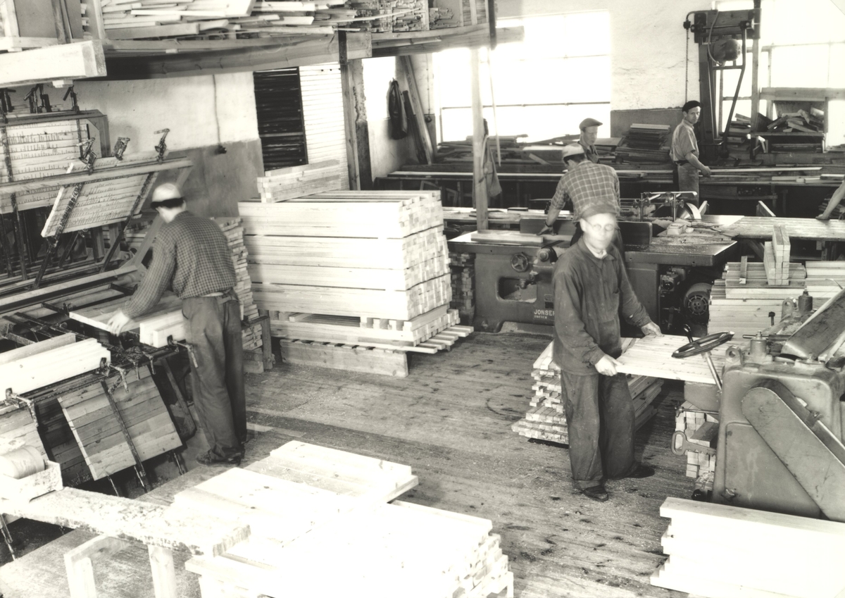 Arbete med trätillagning och limning på AB Standardsnickerier.