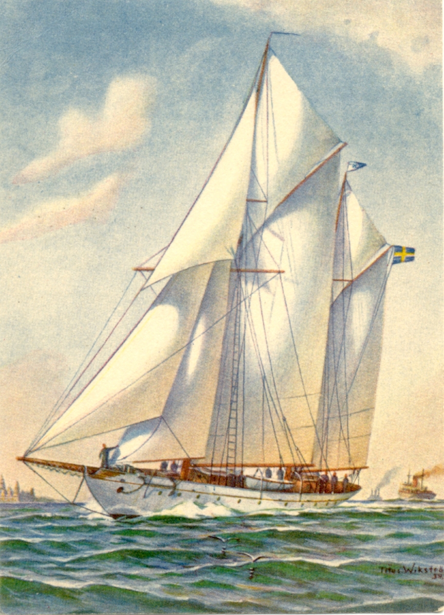 Kaparen, Svenska Seglarskolans nya långseglare, depl, 107 tons, segelarea 325 kvm, byggd 1935 efter Lloyds högsta klass.