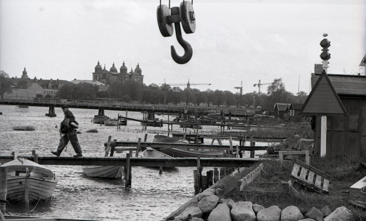 Bilden är tagen på Ängö fiskeläge, in mot Kvarnholmen. Bron leder till Varvsholmen. Mitt i bild ser man att den nya Ängöbron, invigd 1972, håller på att byggas. Vid de två lyftkranarna till höger i bild byggs köpcentrat Kopparslagaren.