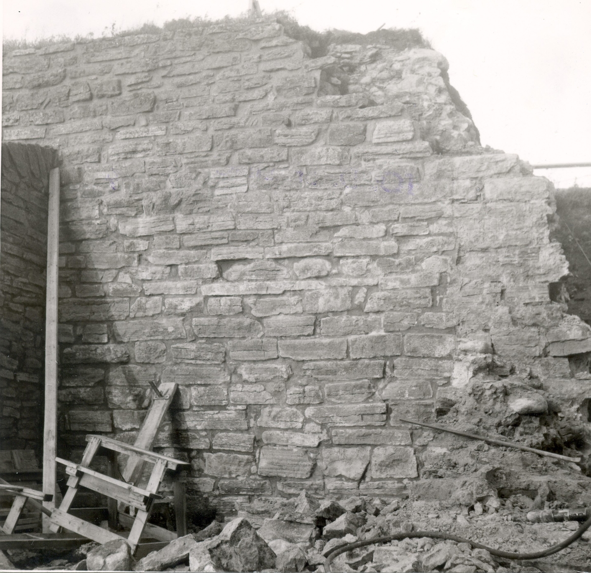Västra förborgen. Nordligaster kontreforen söder om ingångsvalvet. Detaljer av muren under rivningen