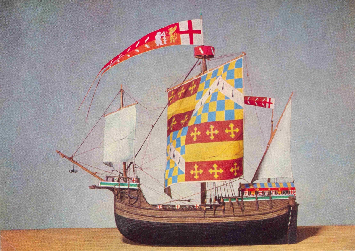 En modell av ett stort skepp eller "kogg" baserat på tillgängliga MS Pageant av Richard Beauchamp, Earl of Warwick på British Museum.