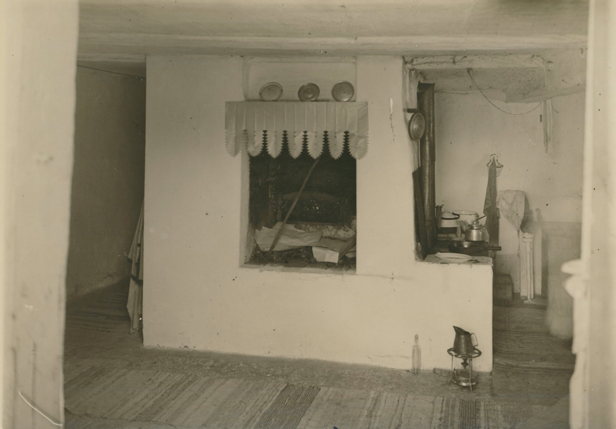 Köket i bottenvåningen. Spis och bakugn, mitt på innerväggen.