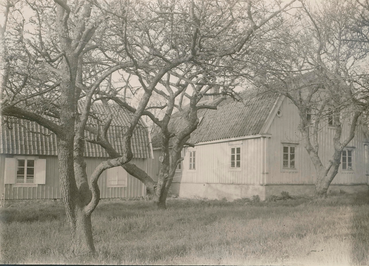 Färjestadens gård. Till vänster handelsboden, till höger flygelbyggnad. Från herrgårdens trädgård.