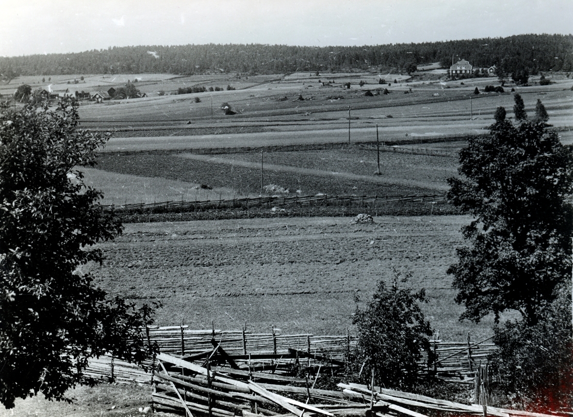 Parti av Mandus Svenssons åkermark. I bakgrunden bortom gärdesgårdarna Skattegårdet. Närmast går den av två gärdesgårdar inhägnade vägen till Lerhagen. Fotot taget från nordligaste nederkanten av Höge backe.