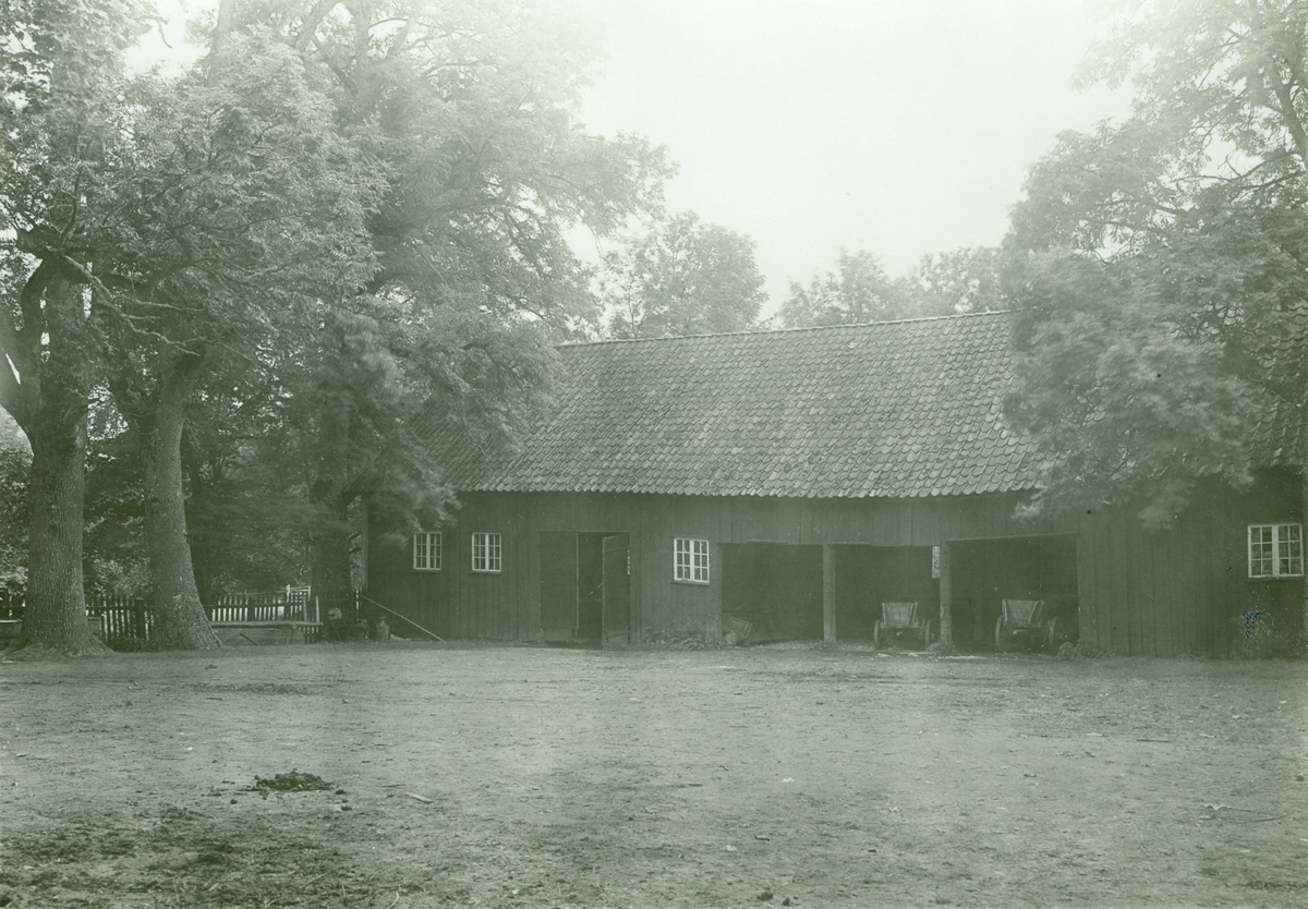 Stallgård: Vagns- och redskapshus av stolpar och bräder på Fågelviks herrgård. En av dörrarna bär årtalet 1859.