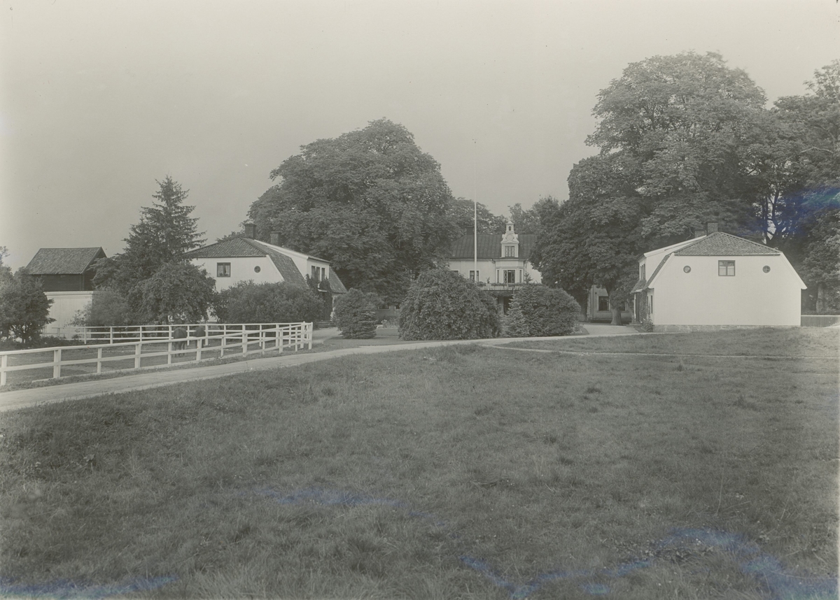 Forsby herrgård. Mangården från söder. Vitputsade träbyggnader. Gamla lönnar och andra parkträd. Längst t.v. syns taket av den gamla spannmålsboden, vilken ligger vid åkanten.
