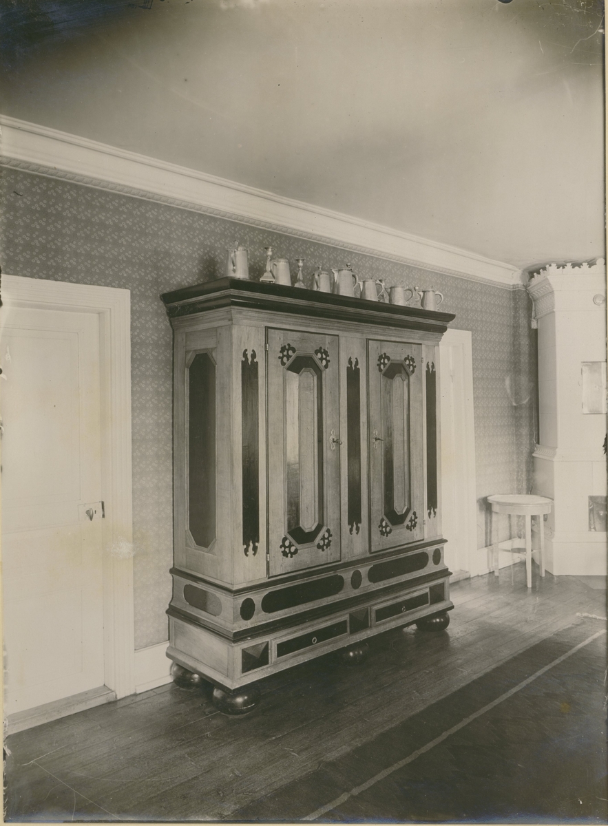 Skåp av ek med fyllningar och ramverk av svärtat trä. Starkt upputsat. Inköpt av ägaren på auktion i orten; har möjligen tillhört någon Posse.