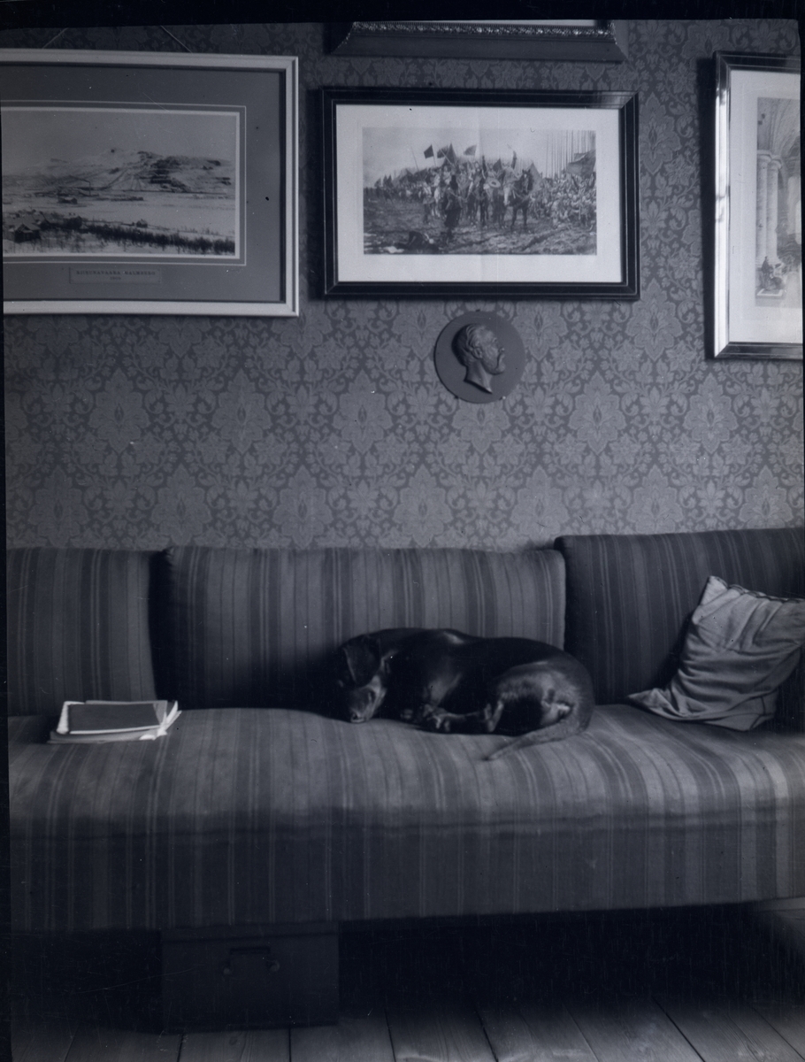 Interiör i Tuna gårds huvudbyggnad. Hund på soffa.