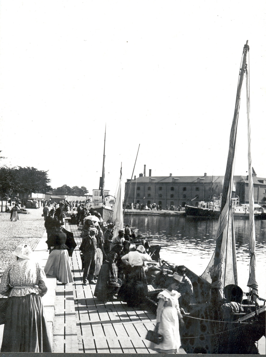 Fiskförsäljning på en brygga. Margarinfabriken i bakgrunden, nuvarande Baronen köpcenter med mera.
