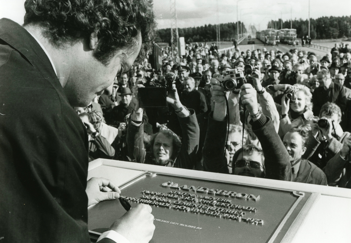 Kung Carl XVI Gustaf (då kronprins) signerar minnestavlan vid tillfället för invigningen av Ölandsbron i september 1972.