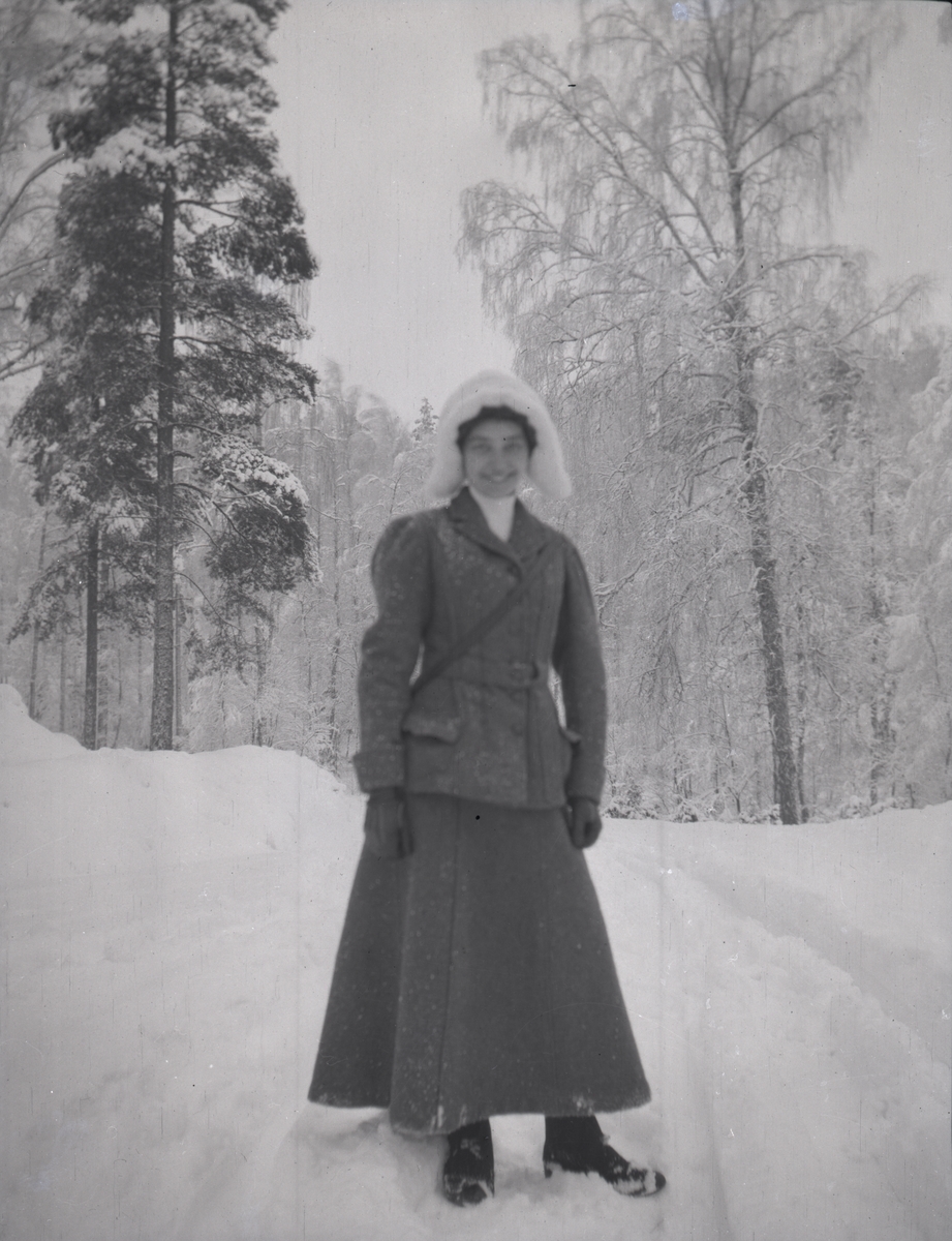 Carin, Henning Hammarskjölds fru, i skogen i närheten av Tuna gård 1913.