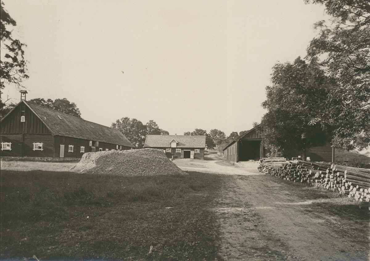 Ladugården från mangårdsbyggnaden. Till höger en loge.