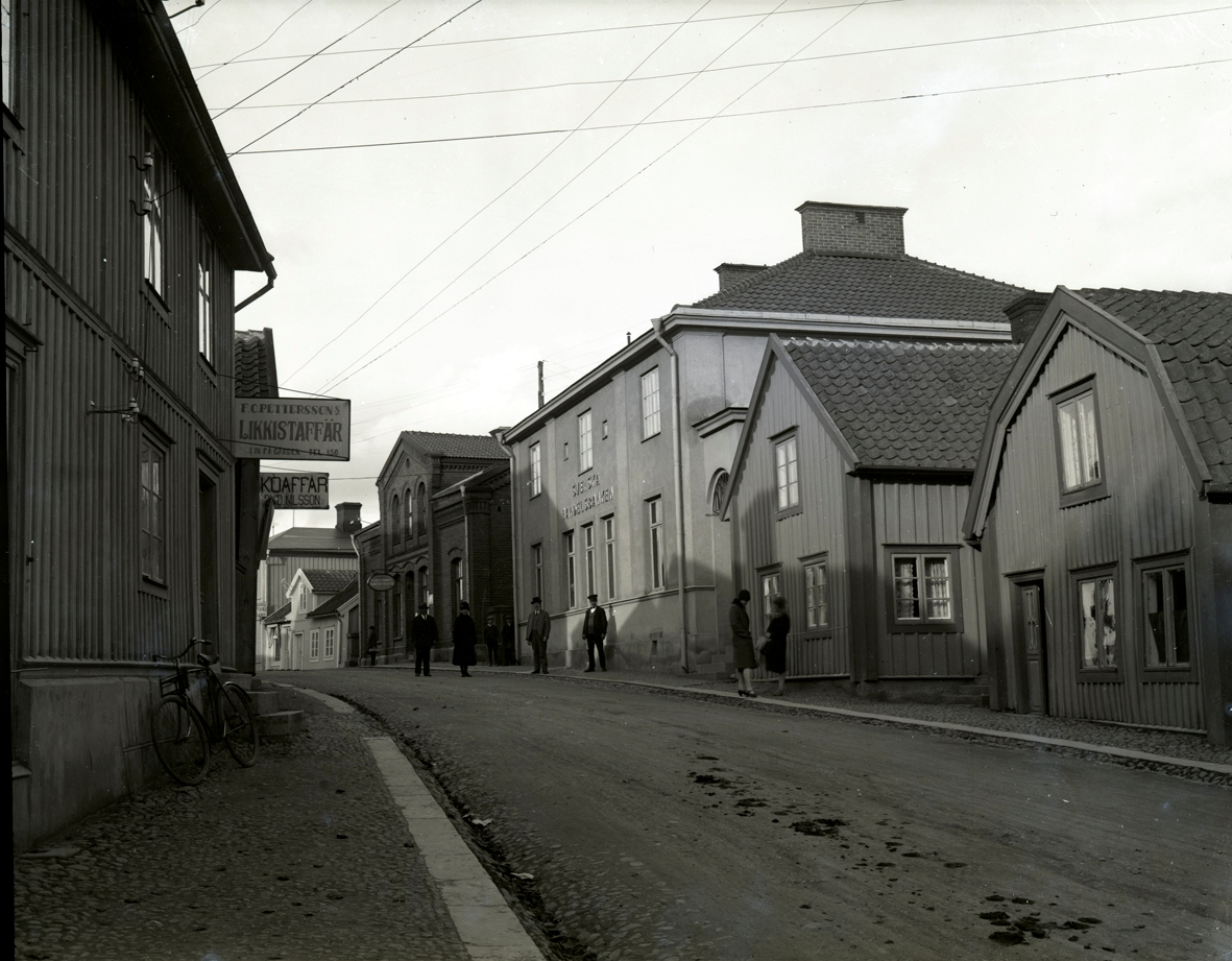 Handelsbankens kontor på Storgatan i Mönsterås. Kontoret finns ännu (2021) kvar, om än med begränsade öppettider. Notera även F.O. Petterssons likkistaffär tvärs över gatan.
