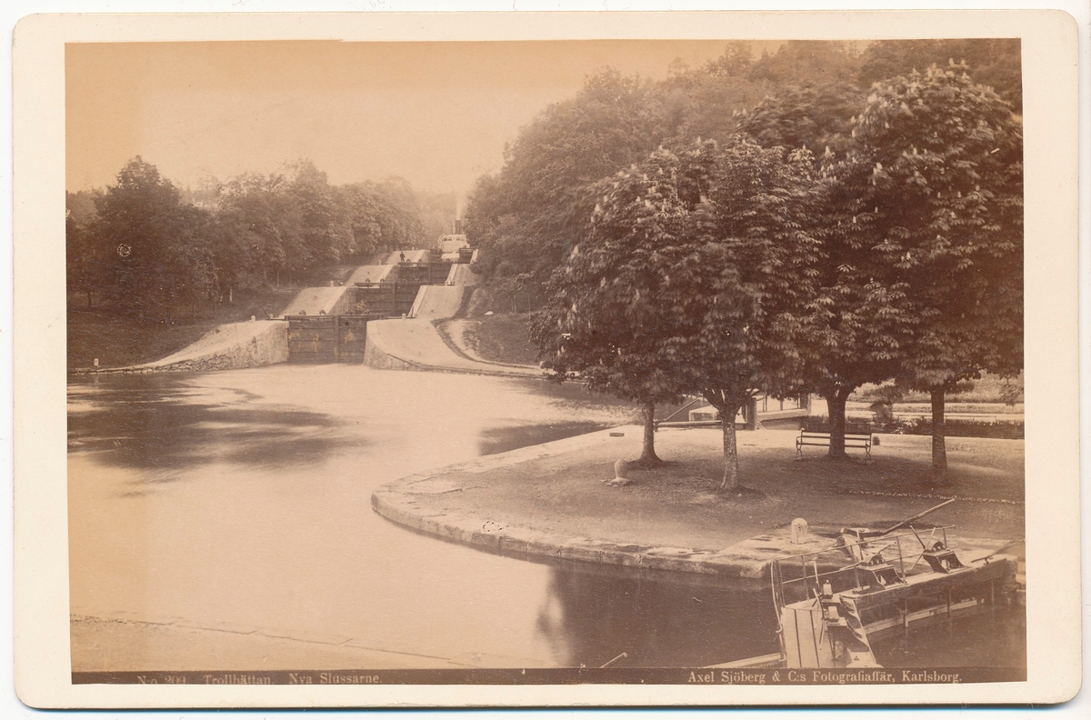 Vy över en park och slusstrappa.
