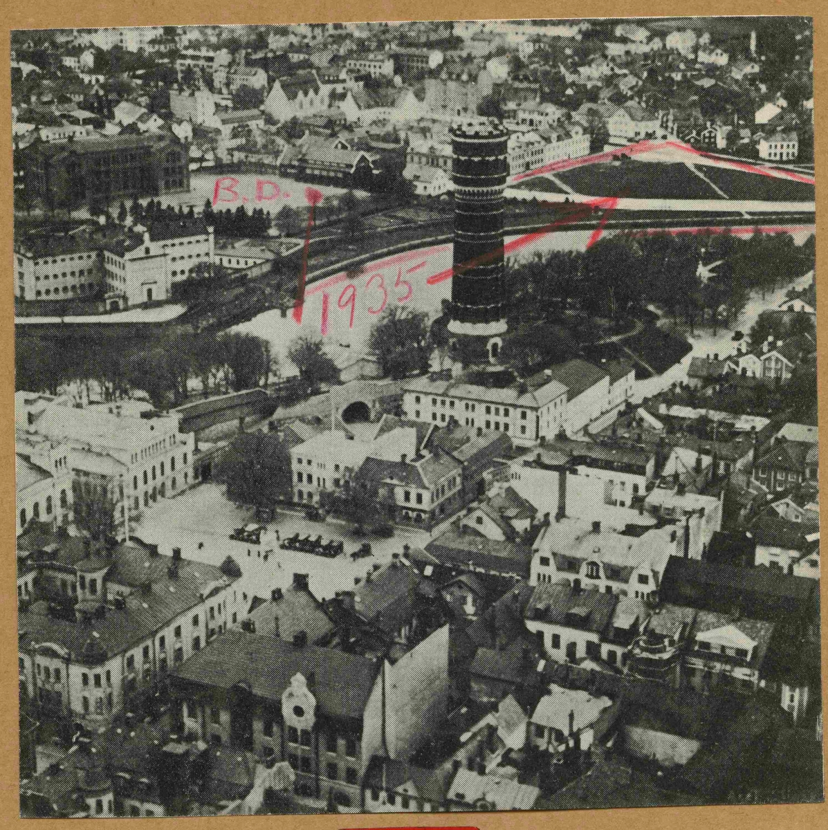 Foto där området som skulle disponeras av Barnens Dag i Kalmar 1935 är inritat.